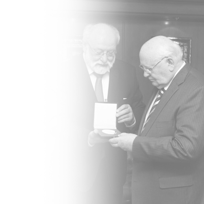 Michail Gorbatschow erhält die Weizsäcker Medaille „für seinen Mut, im Geschick unserer Zeit Verantwortung zu wagen und zu leben, in Würdigung seines Verdienstes, im Wettrüsten der Systeme der Welt in gemeinsam angewandter Vernunft eine offene Zukunft bewahrt zu haben und die Chance, die politisch weiterhin anerkannte Institution des Krieges als Mittel der Konfliktlösung zu überwinden.“ – So hält es die Urkunde fest.